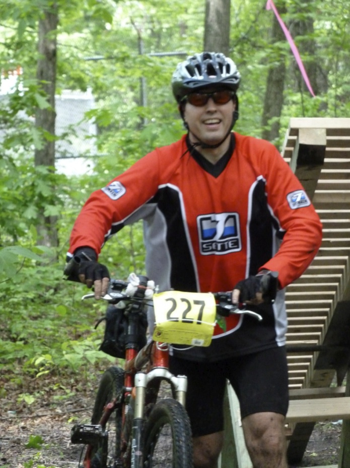 When I reached the main tent, Matt Lebow, the mastermind behind this race, greeted me with a big ear-to-ear grin as he does with everyone. That grin is not just a grin from a man with a great positive attitude about life; that grin told me what I was in store for today, for Matt seems to enjoy watching participants suffer through punishing challenges in his races. That grin was a masochistic one and it was a sign of things to come. Since I arrived early and had some time on my hands, I checked out the various “skills park” challenges that were set up the night before, for this was not simply a bike trail race through the woods, but rather a race to see how well one can control and manipulate one’s bike without getting killed in the process. This was a technical race. There were two huge teeter-totters along the course. Upon finishing a lap, one had to ride up, then down each teeter-totter. The first teeter-totter was easy; the second one was built much higher and narrower; every time I did a test run on it, I almost killed myself. This is when I decided that my racing strategy would be to not kill myself, for my daughter’s 11th birthday party was the next day and she would be let down if her party was cancelled due to me dying.