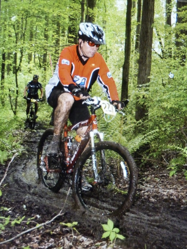 Just when the mud became a major distraction during this race, a more sinister hindrance made itself known and showed me no mercy: another flat tire! Getting a flat tire during a bike race was even more upsetting than dealing with the mud, for at least my bike was moving during my mud-capades. Getting a flat in the middle of the woods was annoying on many levels; you were stuck, and just standing there wasn’t going to help get anything done. First, you had to make sure that you were not blocking the course, for much of it was single-track and out of respect for the other riders, you wanted to make sure you were not in their way. So sometimes, I had to run with my bike to an area wide enough for bikers to get by. Once that was done, I immediately removed my tire with a quick-release lever, unscrewed the air cap and the screw that held the punctured tube onto the rim, then remove the old tube from the tire. Then, and most importantly, I had to very carefully scan the entire inside of the tire with my fingers feeling around for the culprit that was responsible for puncturing my tire. If I didn’t remove this culprit, I would immediately get another flat, so it was essential that I succeed in this step. For most of the flats in today’s race, the culprits seemed to be thorns. This was to happen several more times throughout the race, and I had to change these tires with caked-on mud no less.