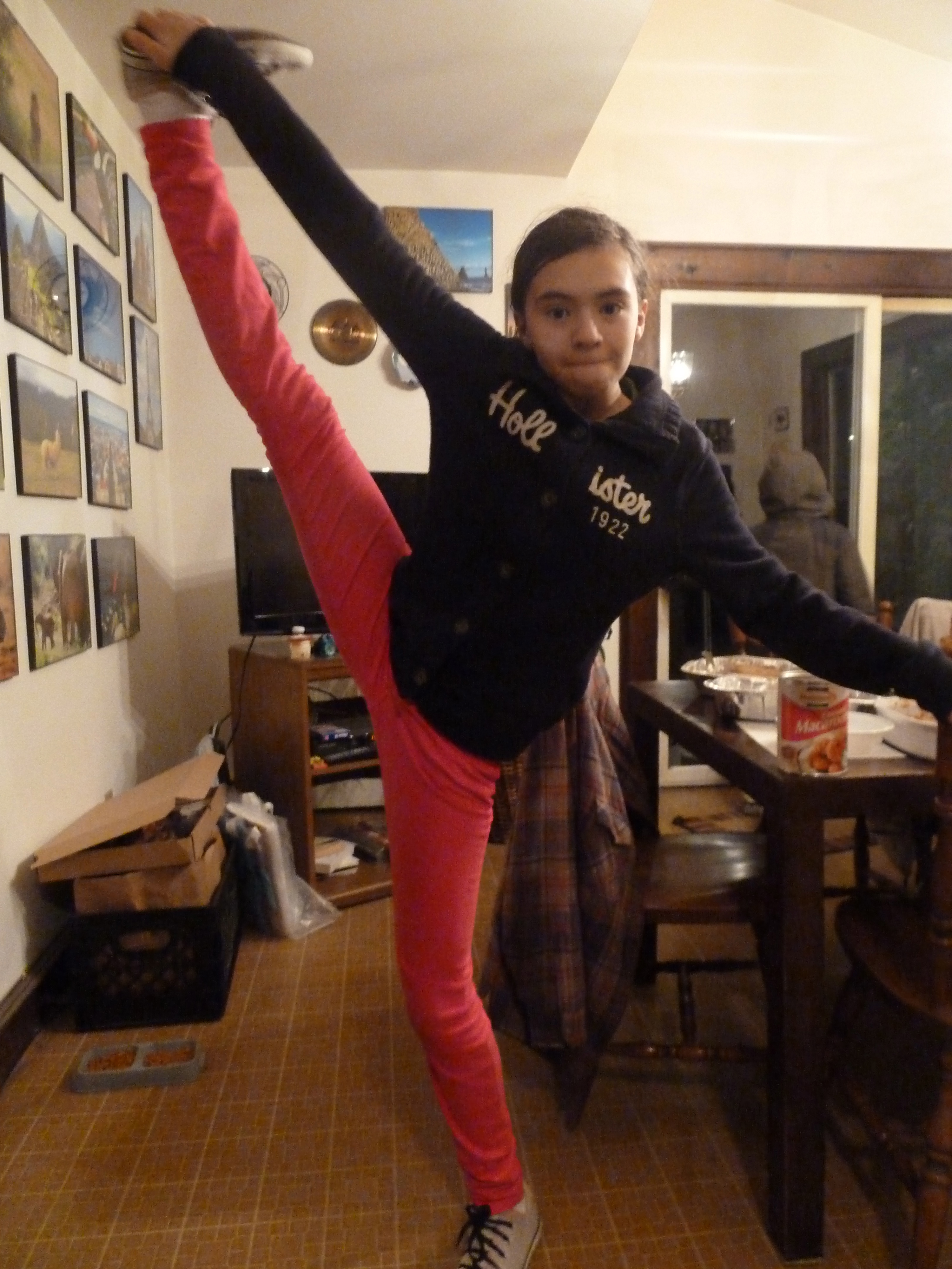 With three years of gymnastics under her belt, Emma has been getting very flexible.  She can easily do splits on the floor as well as in the air.
