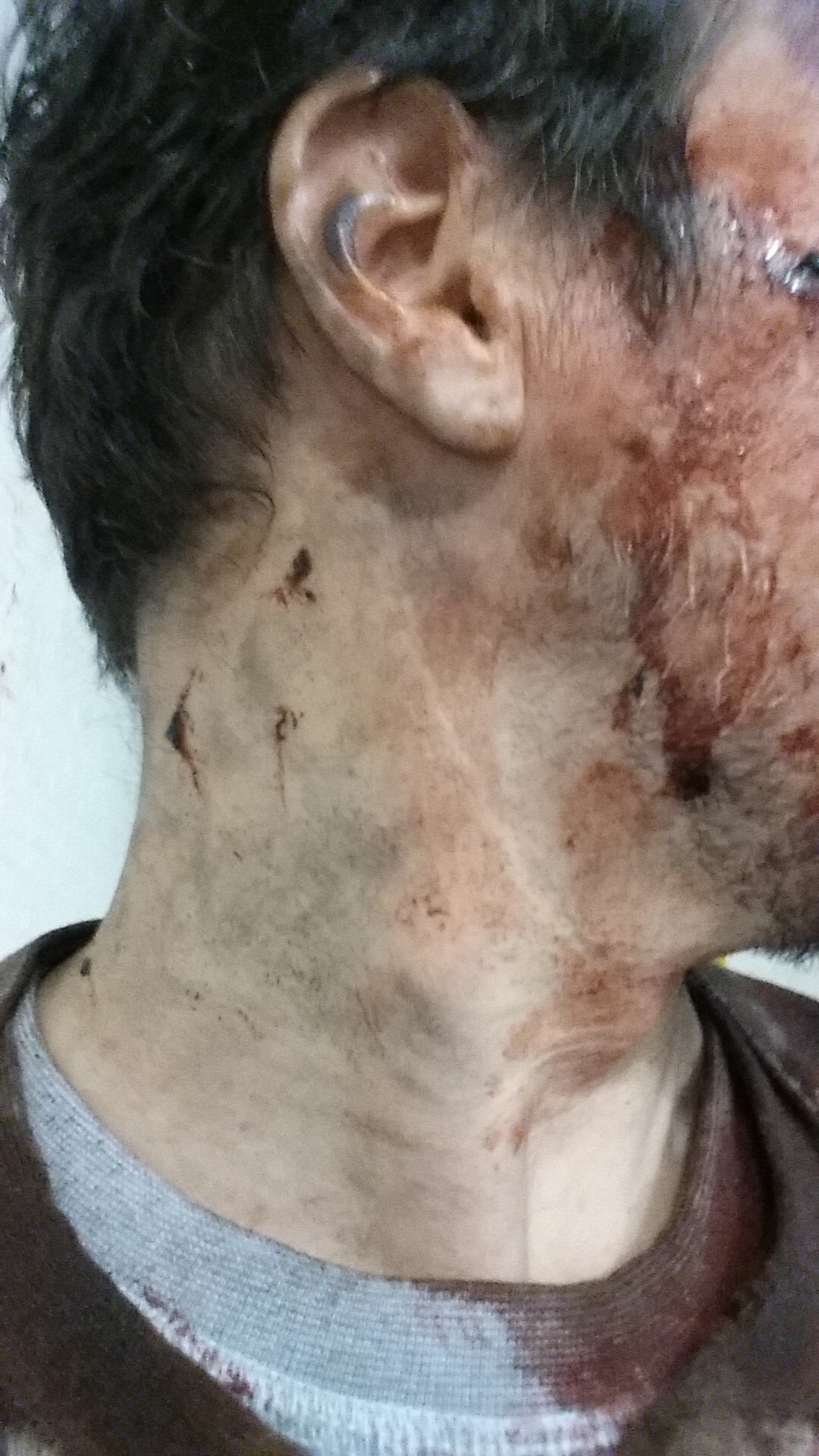 Note: The above photo reflects Day 2 of a two-day shoot. On Day 1, we were all made-up by the fx artists, but were not used after waiting in holding for 12 hours. Below is how I looked on the first day on set. If you look closely, you can see pieces of wood stuck in my neck. The artists glued those into our necks to really bring the impact of the explosion home to viewers.