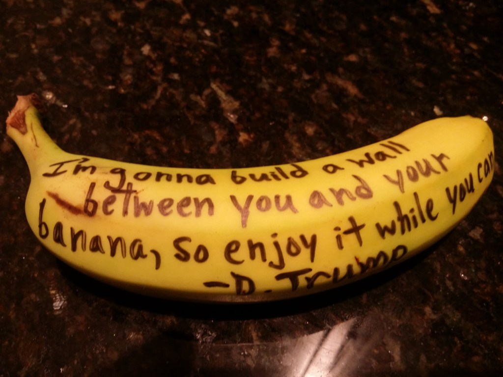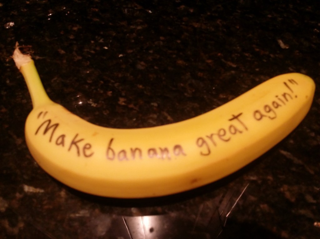 I started connecting my humorous banana messages into current events to make my bananas more politically relevant. Hunter and his fellow classmates were following the 2016 Presidential campaign at the time. That is when Donald Trump began his campaign for President. My banana messages reflected that.