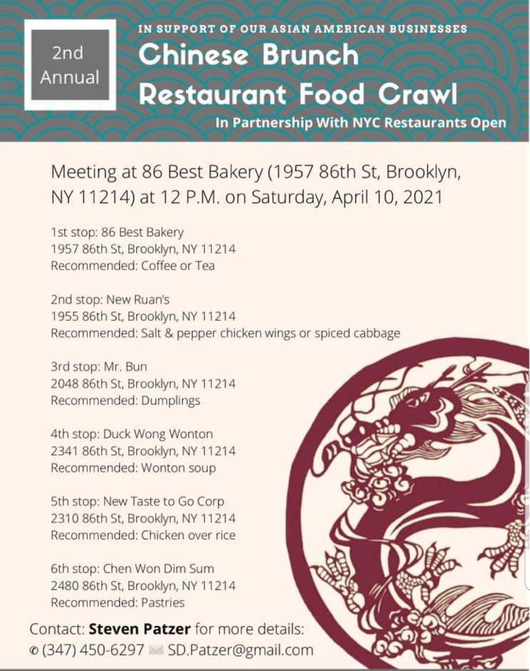 Through the efforts of community activists Steven Patzer and Reyna Gobel, we engaged in the second annual Chinese Restaurant Food Crawl. Among dozens of other great community events, Steven and Reyna initiated the inaugural event at the outset of the pandemic last year to help support locally-owned Chinese restaurants in the area.