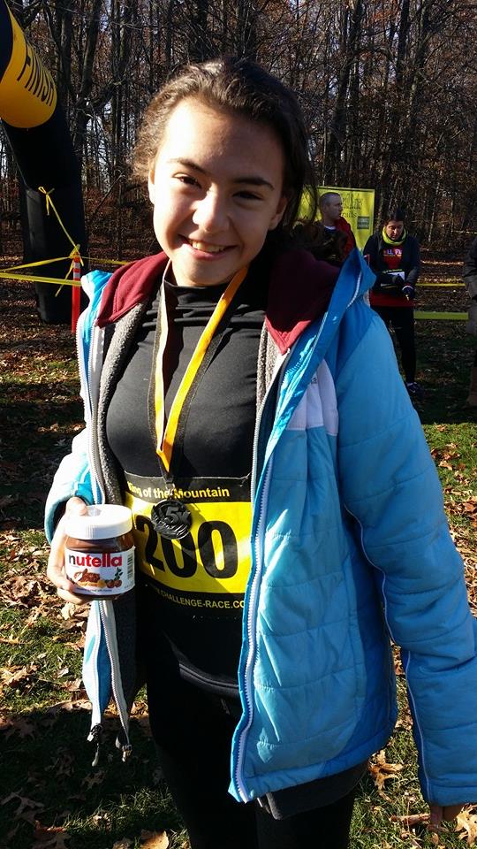 My daughter Emma at age 14 running the Fall Flat 5k, Fall 2014. She came in 10th place out of a field of 124 runners. And yes, that jar of Nutella in her hand was her prize.