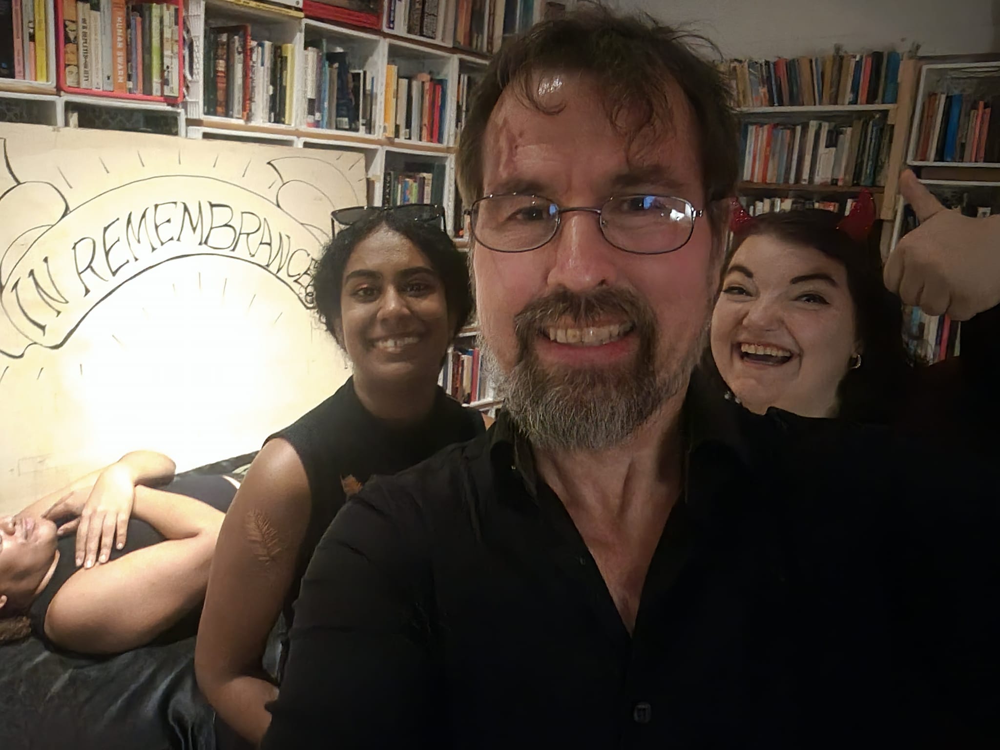 Pictured below: Rodney Umble, unknown, Laura Petit, Me, Rob Reese, unknown, Douglas Cala, and Erin Krom. Crouching with the big googly eyes is Crystal Marie.