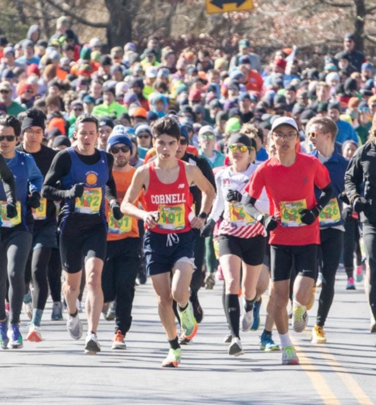 Photos from left: My son leading at the start of the 10k, him encouraging another runner at the finish line of a half marathon.