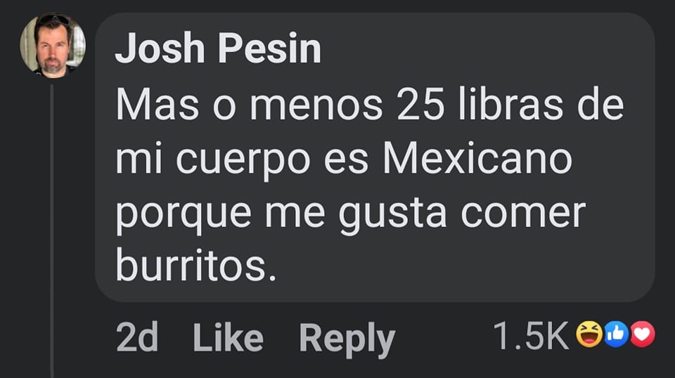 I randomly found a funny video on social media showing an African-American child who is having a meltdown because he insists to his mother that he is Mexican because he eats quesadillas. She reminds him that he is not Mexican which drives him crazy. In response, I wrote the following (see below), which roughly translates as “More or less 25 pounds of my body is Mexican because I like to eat burritos”. This comment has garnered more than 1,500 ‘likes’ and has entertained many among the Mexican-American community. I want to thank Nena Coss for sharing the original post.