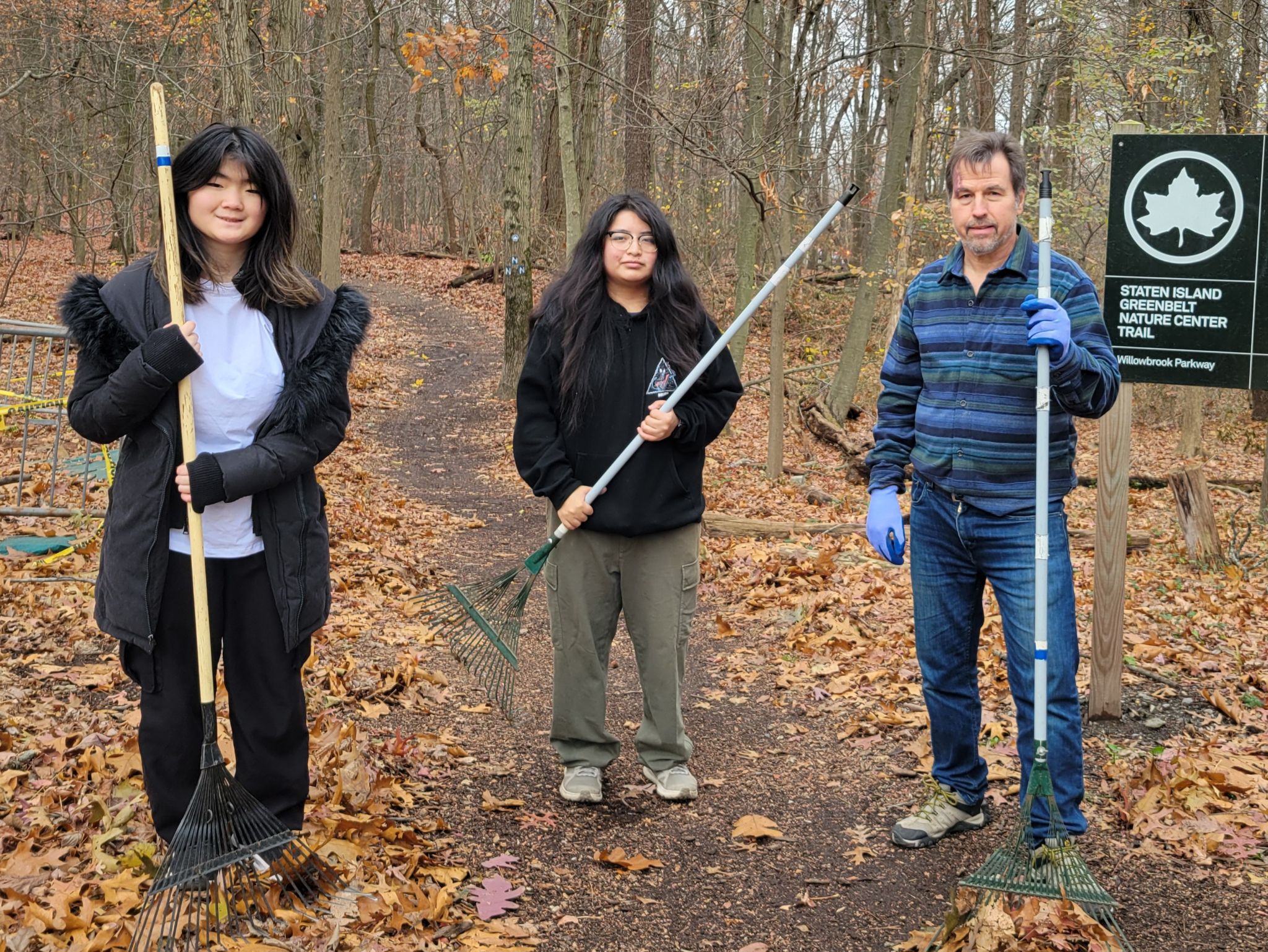 I organized a leaf raking in the Staten Island Greenbelt. Two young volunteers helped me rake about a mile of the family trail. Leaf raking helps uncover the trail route so that hikers using the trail will not get lost.