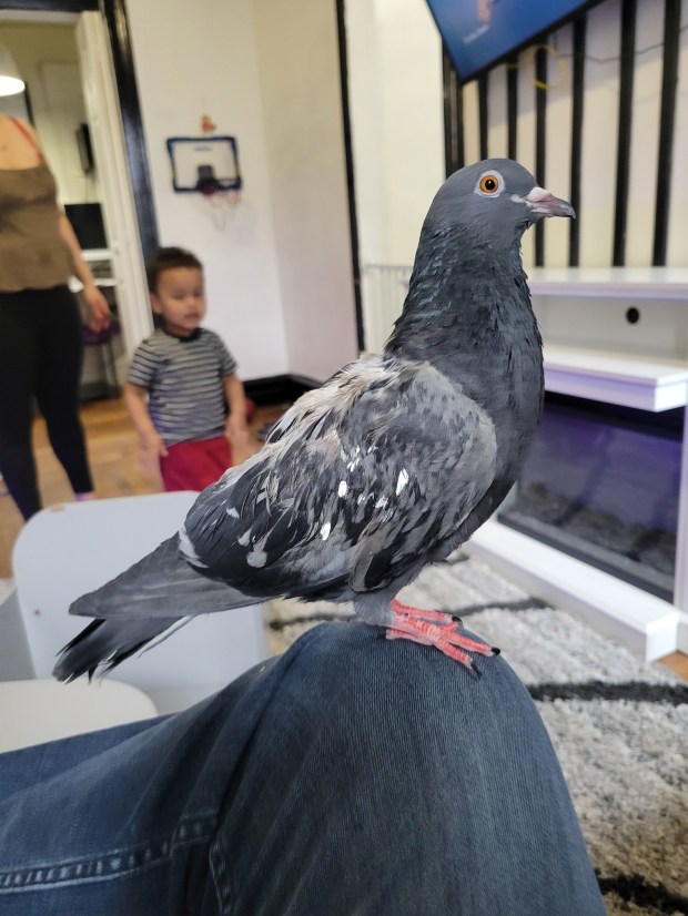 I have been working several part-time jobs to help pay for my son’s college. One of them is to provide early intervention services for special needs children who have not yet reached the age of three. I worked with these children in their homes after my full-time job. One of the children has a pet pigeon. The pigeon occasionally interacts with me during my sessions with the child. Here is the pigeon sitting on my knee.
