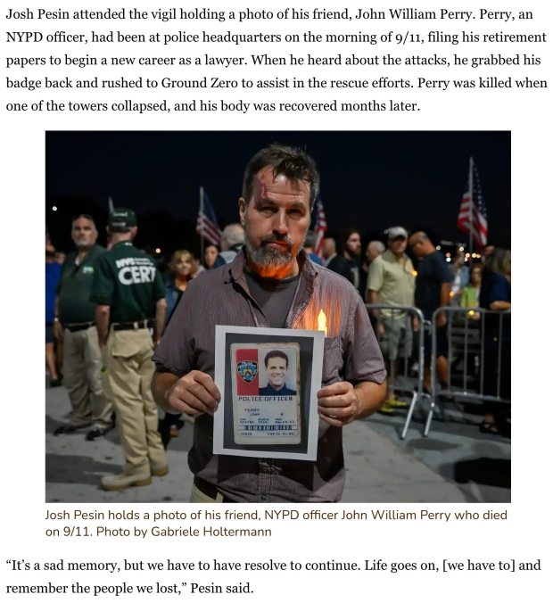 On September 11, the 24th anniversary of the terrorist attack on the World Trade Center, I attended a vigil. I carried a photo of my friend John Perry, a police officer who did not survive after he entered the tower to try to help save others. A reporter interviewed me. You can read the interview here.